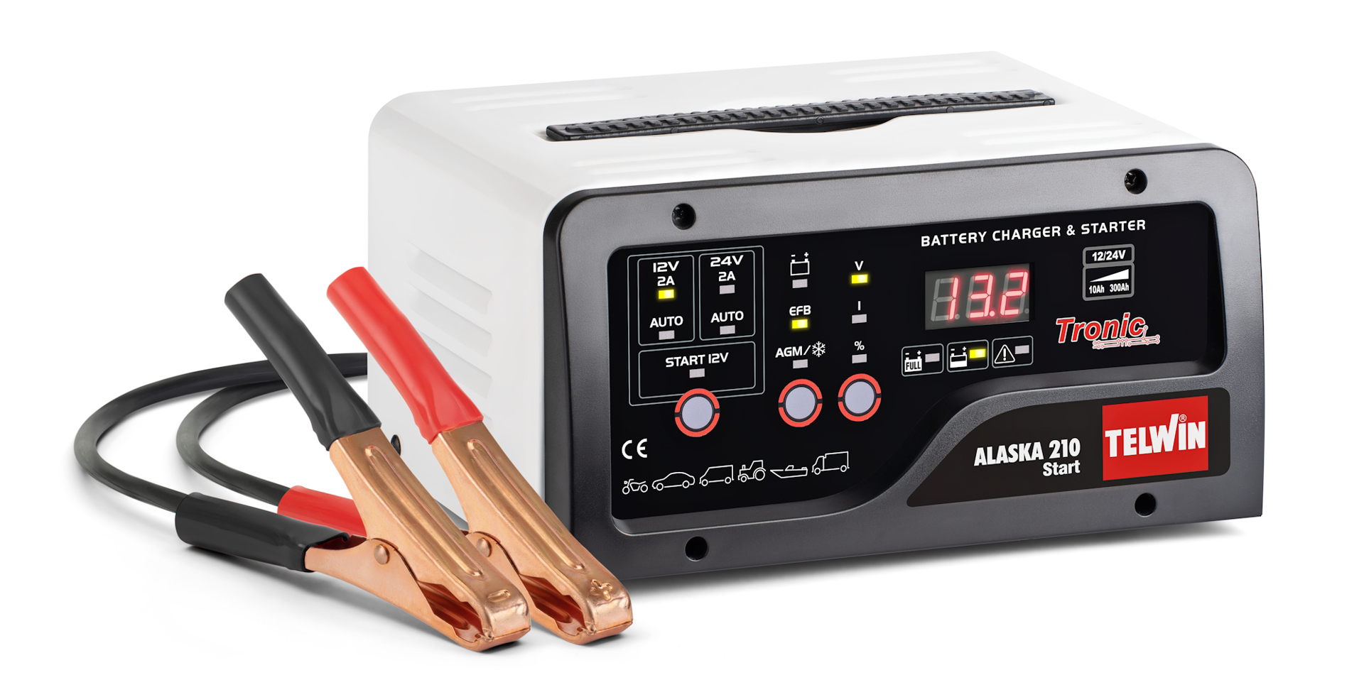 Elektronická nabíjačka s podporou štartu Alaska 210 Telwin, 12/24 V / 23 A s pomocným štartom max. 150 A pre akumulátory 25-300 Ah, vhodná pre osobné automobily.