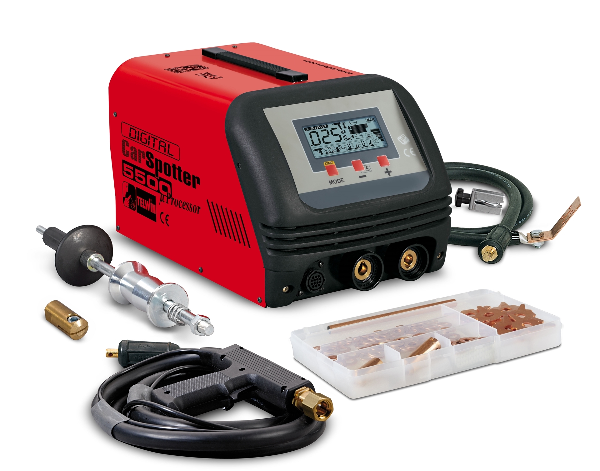 Multifunkčná mikroprocesorová bodová zváračka Telwin Digital Car Spotter 5500. Pre bodovanie plechov, nitov, skrutiek, klincov, podložiek, drôtových vlnovcov, žíhané vyťahovanie plechov. Voľba režimov pre rôzne bodovacie nástroje, voľba režimu pre bodovanie rôznych hrúbok plechov, voľba režimu žíhanie. Napájanie 230 V, pre plechy max. 2x1,5 mm