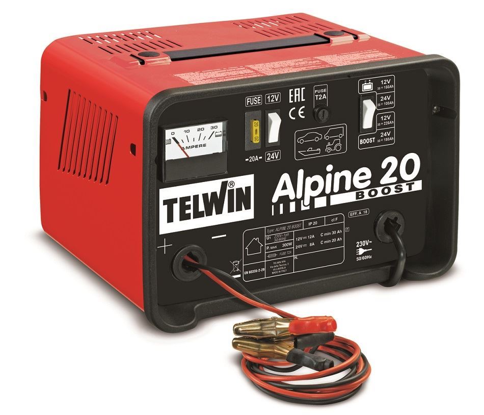 Nabíjačka autobatérií Telwin Alpine 20 Boost 12/24 V, 18/12 A, pre automobilové batérie 30-225 Ah s elektrolytom, rýchle-pomalé nabíjanie, vhodná aj pre autá s dieslovým motorom.